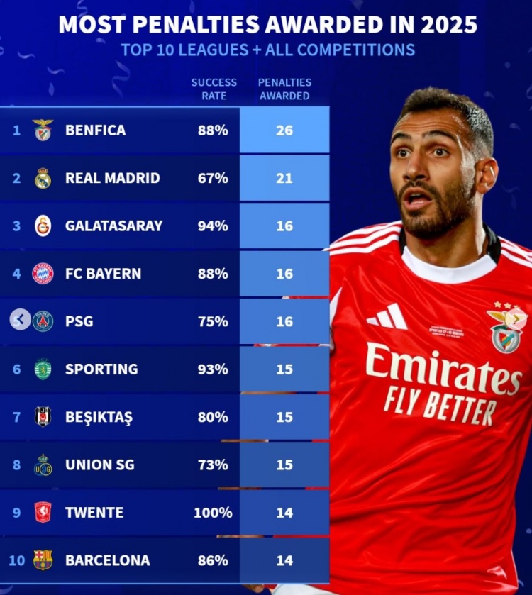 1月5日讯 《转会市场》统计了2025年前十联赛俱乐部各项赛事共计获得点球情况及其命中率,本菲卡26球居首。