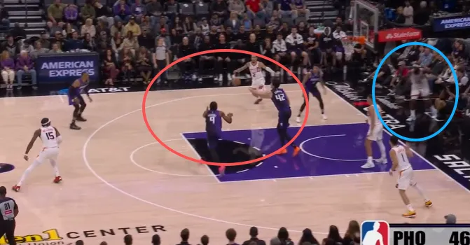克利福德翻身后仰强投被帽,阿丘瓦拿到地板球后面对前来扑防的布克:先是虚晃,